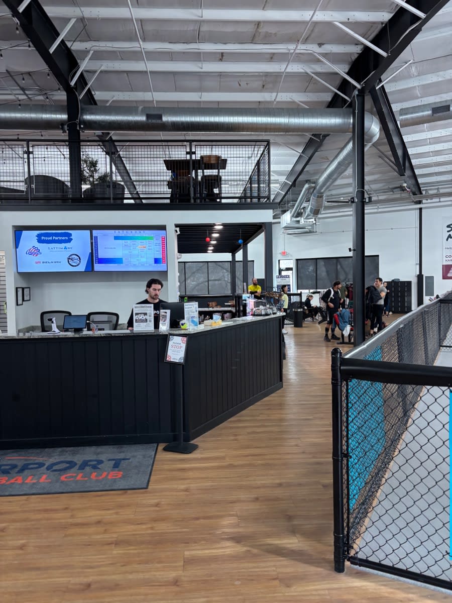 The mezzanine above doubles as a spectator area โ you can watch the courts below while you're between games or waiting on a friend to finish their session. That layered relationship between the social space and the playing space is what makes this facility feel whole.