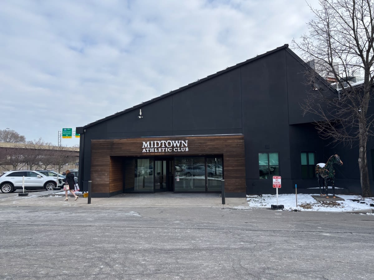 The exterior of Midtown Athletic Club makes a statement. Dark barn-style facade, warm wood cladding, glass entry doors that catch the light just right — this is a facility that clearly had a serious budget and a clear vision for its brand. Walking in, you're greeted by the kind of polished signage and upscale finishes that signal we thought about this. Fitness equipment is gleaming. The lobby feels intentional.